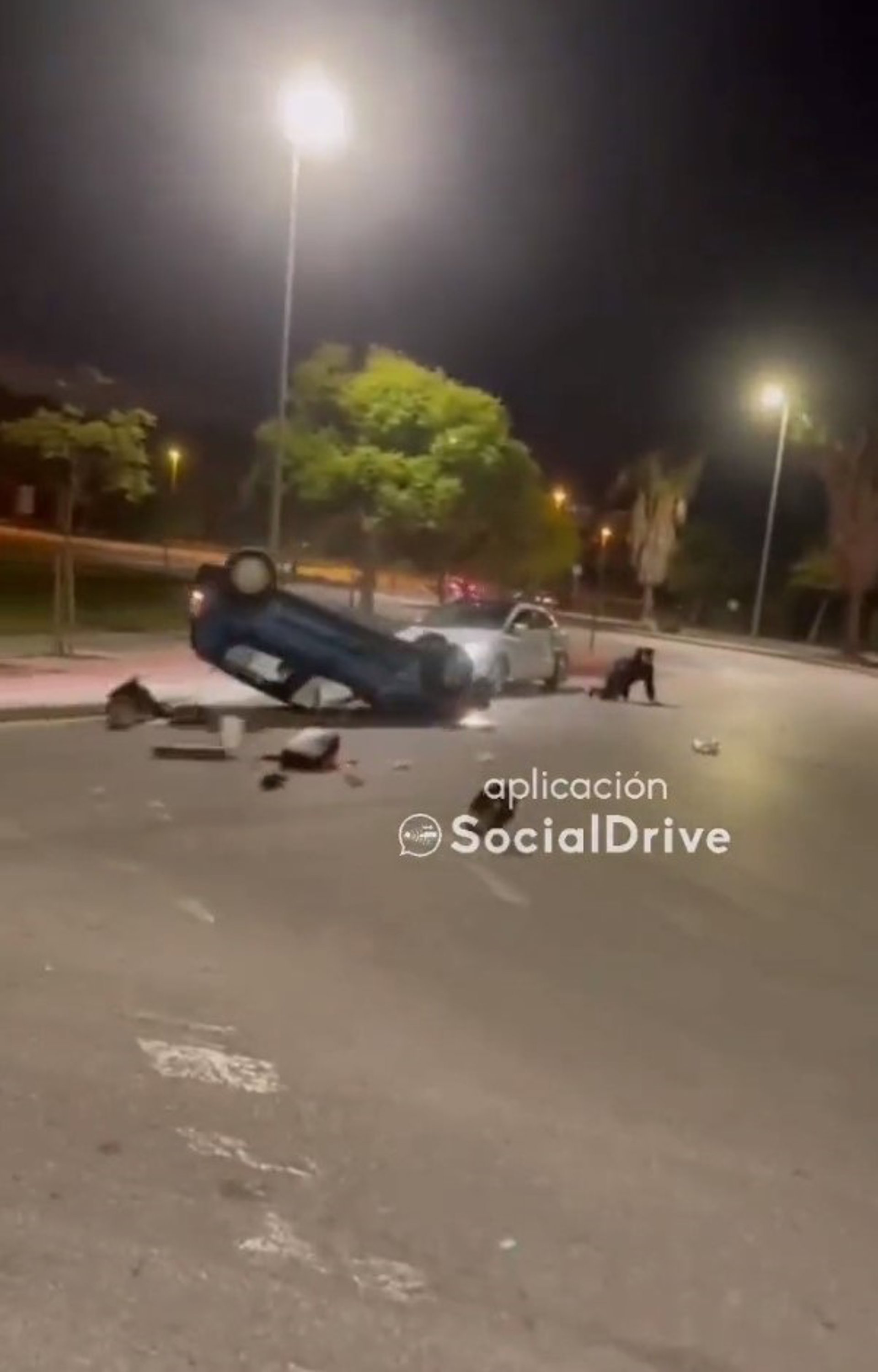 Un vehículo vuelca en una rotonda, con un ocupante sentado en la ventanilla, y choca contra otro coche - TWITTER SOCIALDRIVE