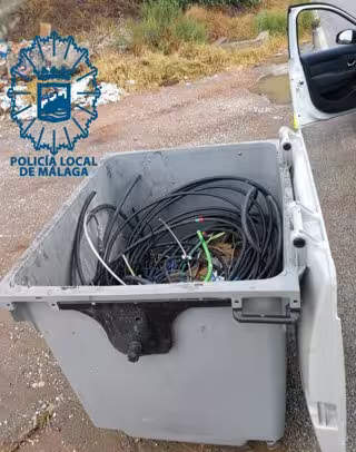 Efectivos de la Policía Local de Málaga han detenido a un individuo natural de Málaga y de 20 años tras ser sorprendido con unos 100 kilos de cables en un contenedor de Limasa, cuyo valor, además, supera con creces los 400 euros. A ello, además, se le suma la presunta autoría de los delitos de desobediencia, atentado y amenazas graves a agentes de la autoridad, junto con una búsqueda y detención por conducir sin carné.