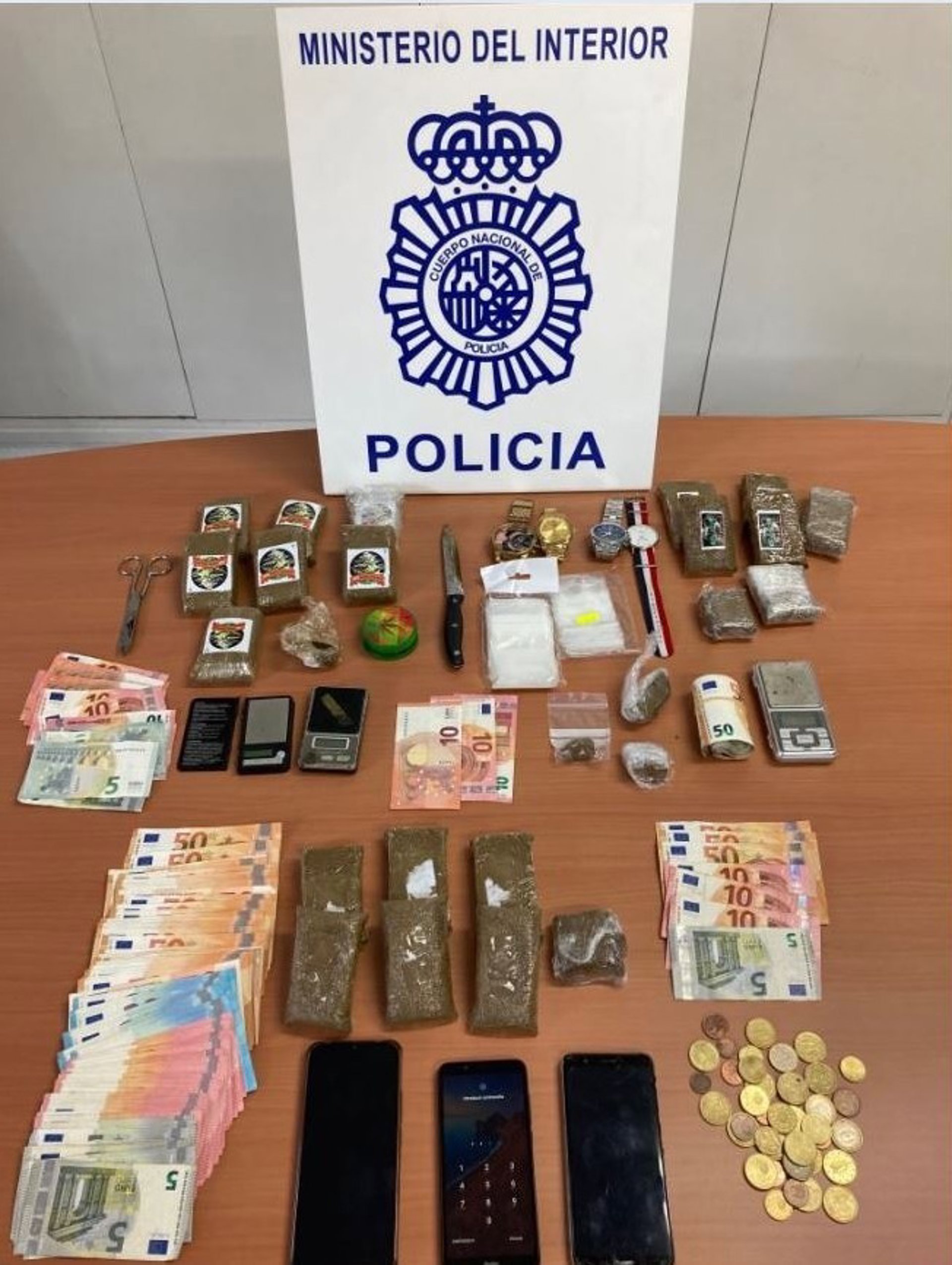 En el momento de la detención, los agentes se incautaron de 100 gramos de hachís y 2.070 euros. Posteriormente, realizaron dos registros en los que localizaron otros 1.300 gramos más de hachís y 900 euros.