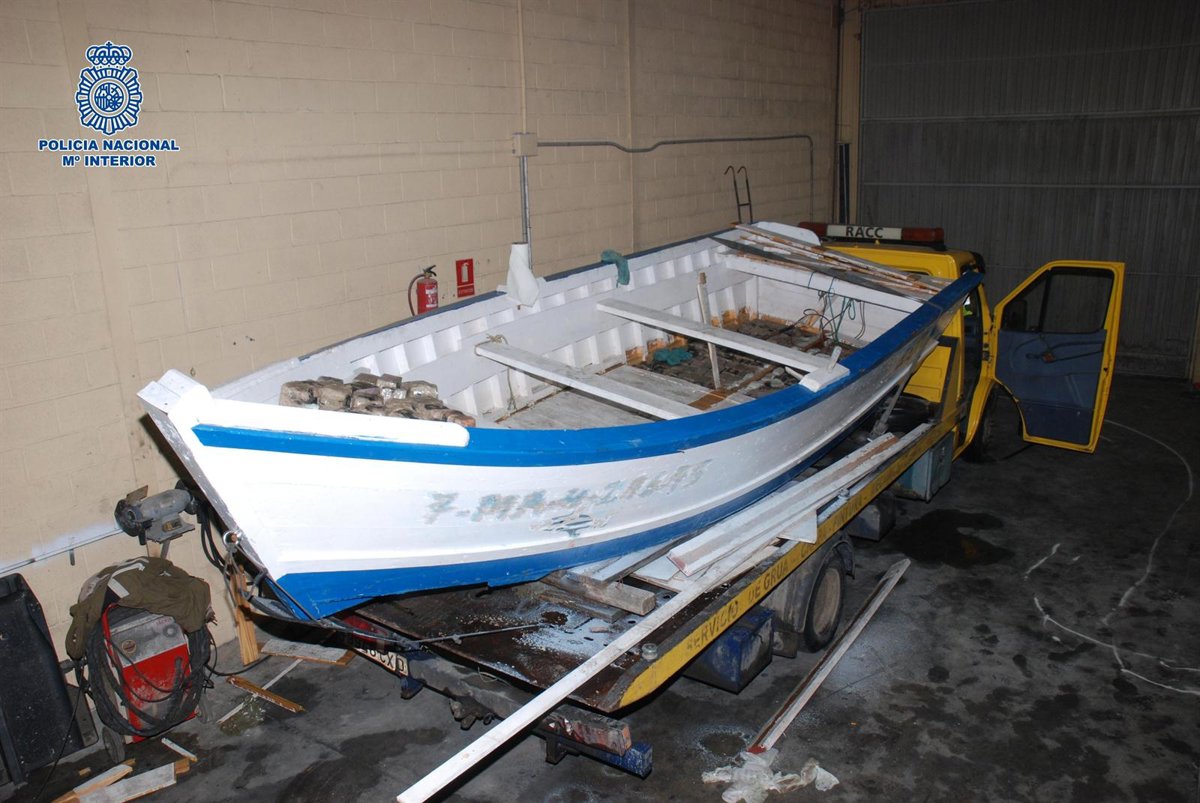 En el interior del almacén, los investigadores hallaron la patera, aún en la batea del vehículo, y esparcidos por el piso varios paquetes de hachís, así como a tres hombres, dos de ellos manipulando en el interior de la embarcación, que fueron detenidos. Igualmente los agentes comprobaron que la embarcación tenía varias tablas del suelo levantadas, localizando en su interior un habitáculo a modo de doble casco que ocultaba el resto de la droga intervenida en la operación.