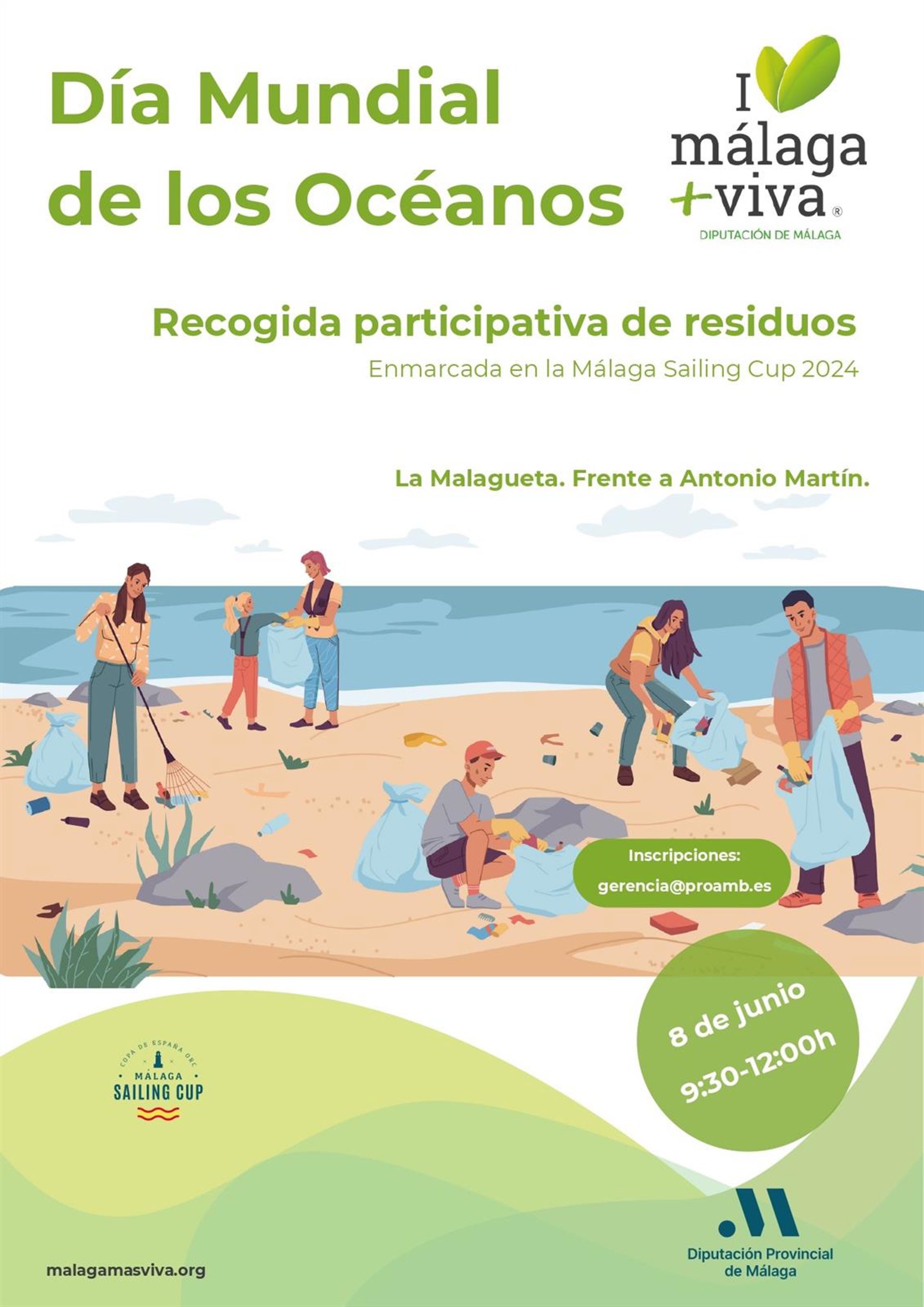 La Diputación de Málaga celebra el Día Mundial de los Océanos con una recogida participativa de residuos en la playa de La Malagueta. En concreto, medio centenar de personas podrán participar este sábado, 8 de junio, en esta actividad enmarcada en las regatas Málaga Sailing Cup, que se celebran este fin de semana en la bahía malagueña.