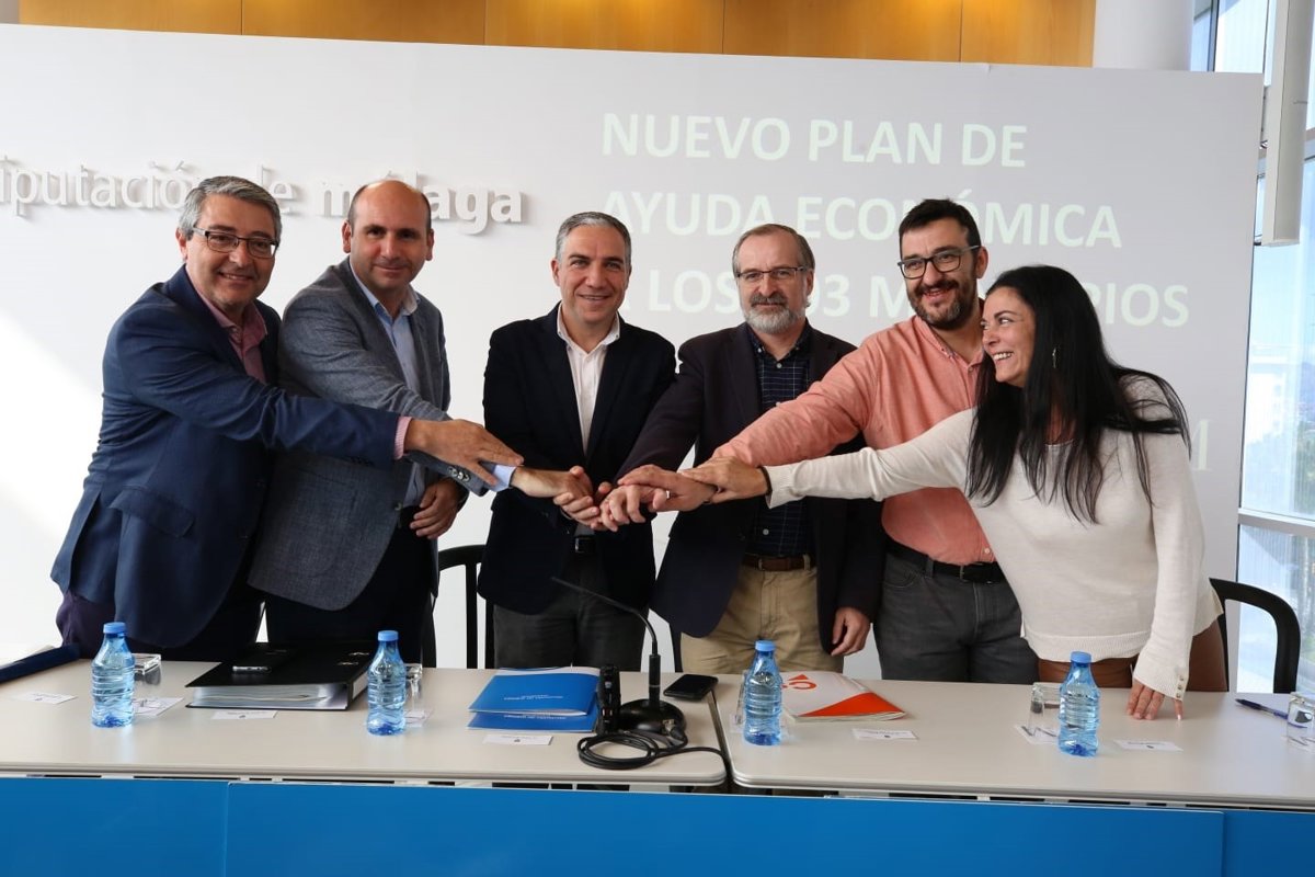 El presidente de la Diputación, Elías Bendodo, ha explicado antes del pleno extraordinario los aspectos de este Plan de Asistencia Económica Municipal junto a los portavoces de toda la Corporación: Francisco Salado (PP), Francisco Conejo (PSOE), Guzmán Ahumada (IU), Gonzalo Sichar (Ciudadanos) y Rosa Galindo (Málaga Ahora).