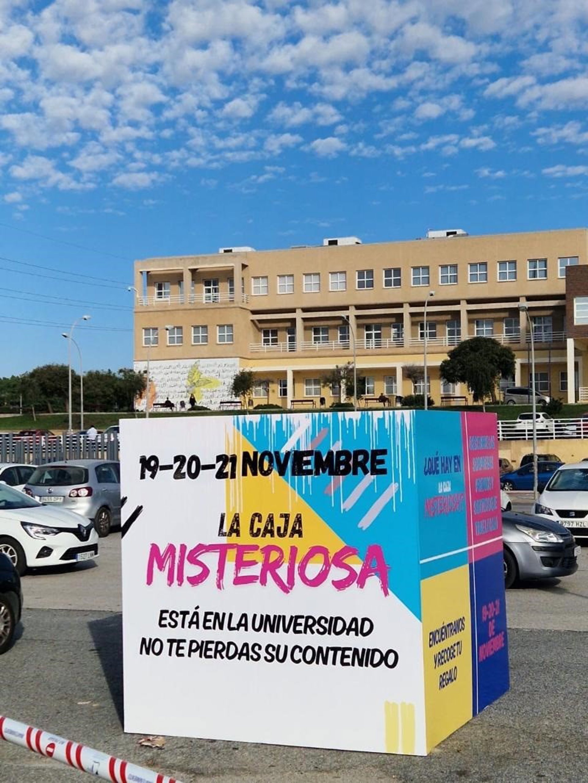 Dos grandes cajas situadas en el en los aparcamientos de la facultad de Psicología y en Avenida Louis Pasteour, jugarán con el público a través de la intriga y la sorpresa, sin revelar el contenido del proyecto, pero invitándoles a que estén pendientes de las actividades que comenzarán a partir del miércoles 20 de noviembre y hasta el viernes 22, que traerá sorpresas y regalos para las personas que participen.