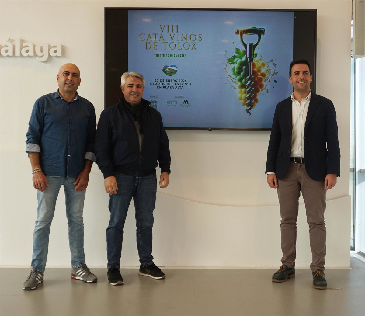 El diputado provincial José Santaolalla junto al alcalde de Tolox, Jerónimo Macías, y el concejal de Festejos, David Vera, ha presentado la VIII Cata de Mosto que se celebra este sábado 27 de enero desde las 12.30 horas en la Plaza Alta de la localidad. - DIPUTACIÓN DE MÁLAGA