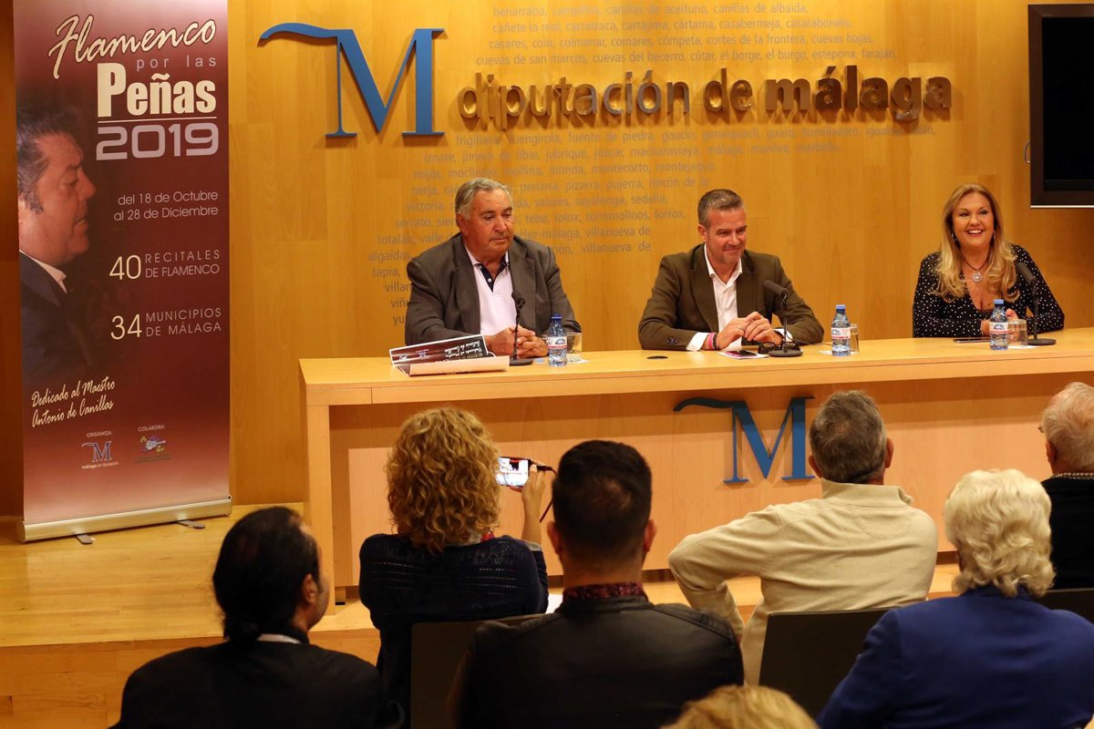 El diputado de Cultura, Víctor González, ha presentado este jueves la programación del circuito 'Flamenco por las peñas', que está estructurado en tres ciclos: el tradicional 'De peña en peña', 'El baile por bandera' y 'Málaga cantaora'. En el primero de ellos 74 artistas llevarán el flamenco a 34 municipios.