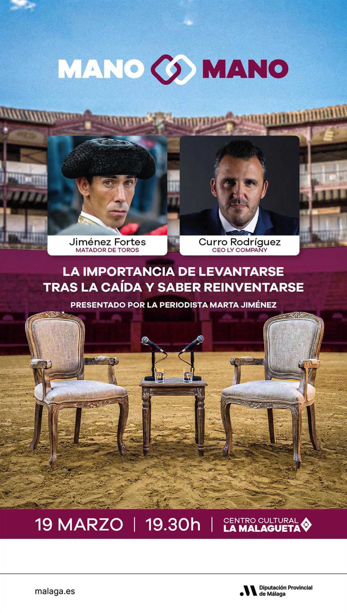 La Diputación de Málaga, a través de la Unidad de Asuntos Taurinos, ha organizado un coloquio entre el matador de toros Saúl Jiménez Fortes y el empresario Curro Rodríguez, CEO de LY Company Group, bajo el título 'La importancia de levantarse tras la caída y saber reinventarse'. La charla se celebrará bajo el formato de 'mano a mano', una actividad que se pretende realizar de manera recurrente en los actos con motivo del 150 aniversario de la plaza de toros de La Malagueta, haciendo un símil con la temática taurina.