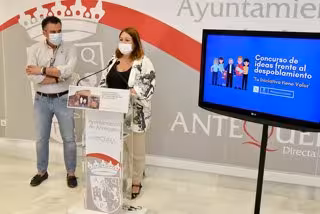 La vicepresidenta cuarta y diputada de Ciudadanía y Atención al Despoblamiento, Natacha Rivas, junto al diputado provincial y concejal del Ayuntamiento de Antequera, Juan Álvarez, ha presentado este miércoles en Antequera, para la zona de Normorma y Guadalteba, el premio que convocará la institución provincial titulado 'Tu iniciativa tiene valor'.
