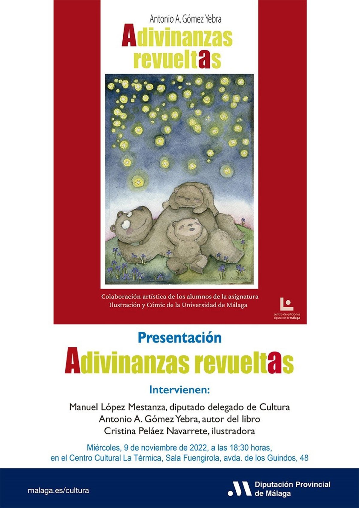 La Diputación de Málaga retoma la publicación de la colección de poesía infantil 'Caracol' con el título 'Adivinanzas revueltas'. El número 42 incluye textos de Antonio A. Gómez Yebra (director de la colección), prólogo de Cristina Peláez Navarrete y la colaboración de cincuenta y ocho ilustradores, alumnos y alumnas de la Facultad de Bellas Artes de la Universidad de Málaga.