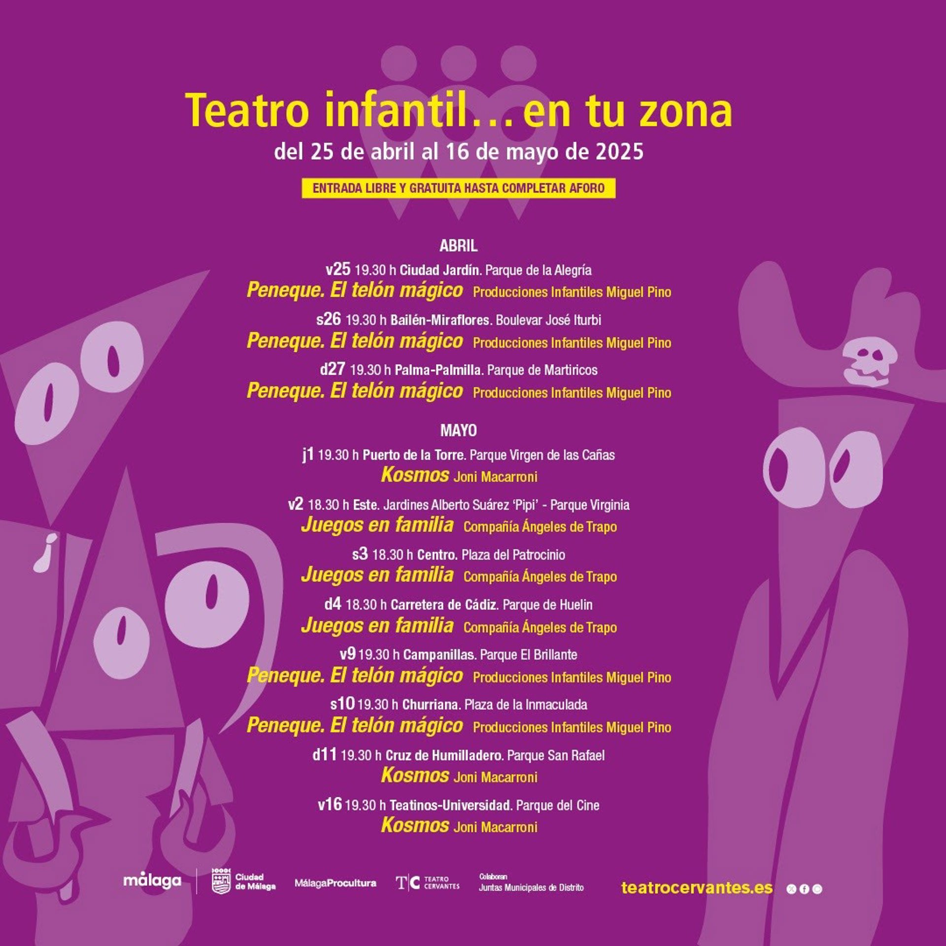 La nueva edición de 'Teatro Infantil... en tu zona', un programa organizado por el Teatro Cervantes con la colaboración de las juntas municipales de Distrito para completar la oferta escénica dirigida a los más pequeños y su familia, propone esta primavera once citas al aire libre y con acceso gratuito hasta completar aforo.