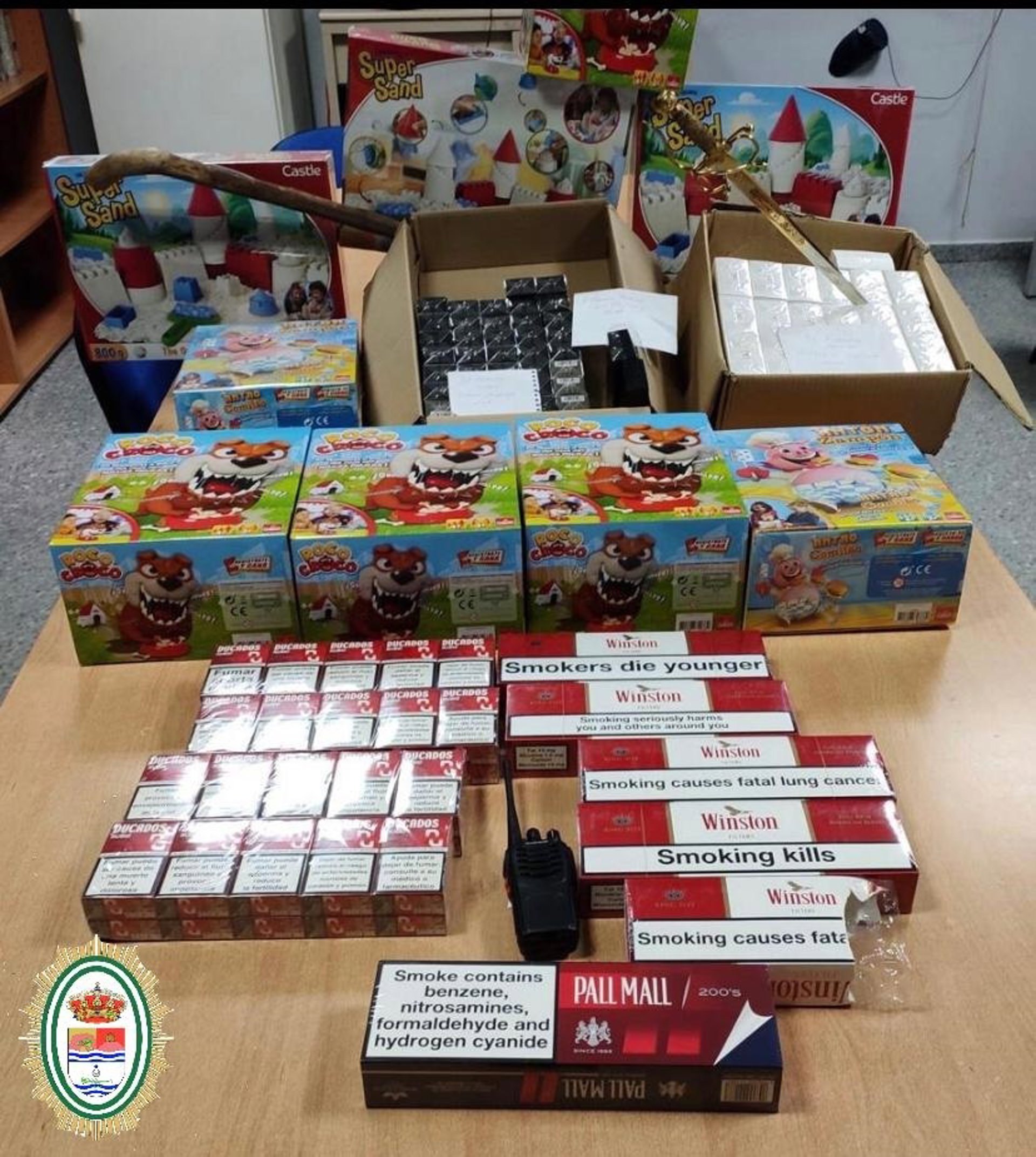 Al observar el nerviosismo de ambos sujetos, los agentes se percataron de que los individuos poseían un walkie semiprofesional sospechoso, por lo que procedieron al registro del interior del vehículo, localizándose diez cartones de tabaco de contrabando con un total de 95 cajetillas, varias cajas de juguetes repetidos y una navaja de grandes dimensiones escondida debajo de la sudadera del copiloto. Además de varias cajas que contenían un total de 51 botes de perfume de la misma marca.