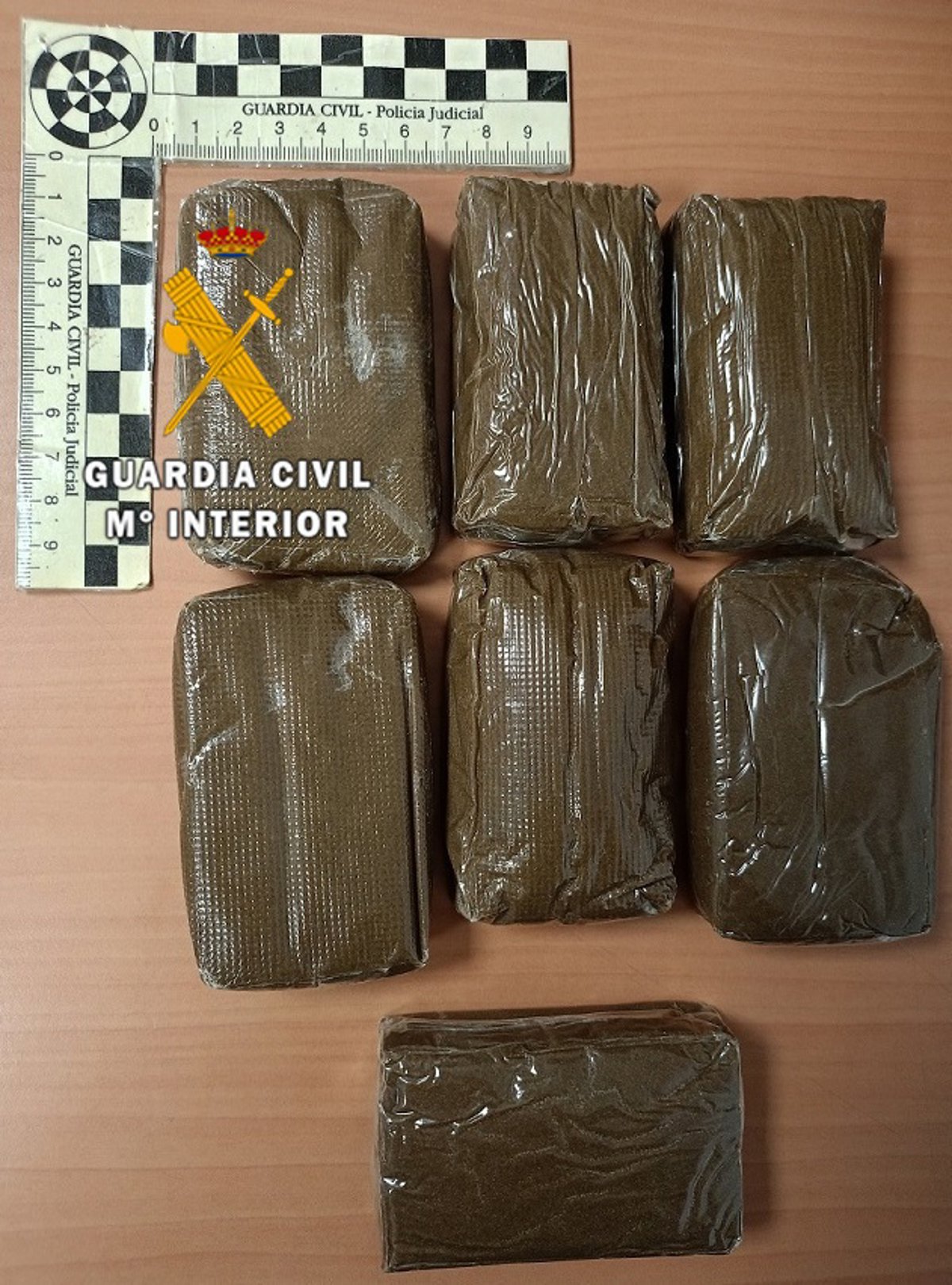 Los guardias civiles bloquearon la salida de los dos ocupantes y recuperaron inmediatamente los bultos lanzados que contenían siete tabletas de hachís compactadas y listas para su distribución, que arrojaron un peso de 716 gramos.