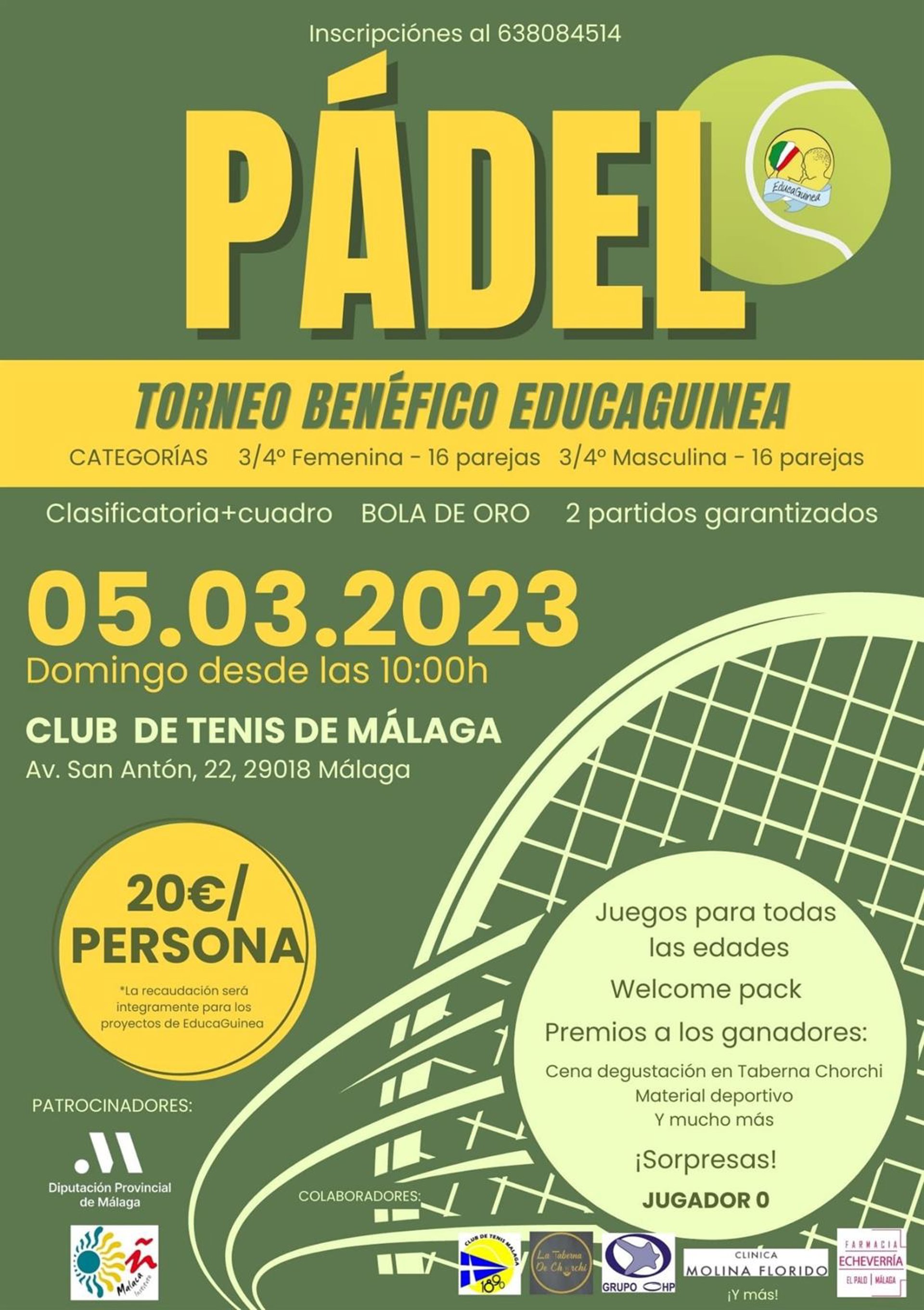 Este torneo tendrá lugar a partir de las 10.00 horas en el Club de Tenis Pinares de San Antón y aquellos que quieran inscribirse como participantes (20 euros por persona) deben hacerlo a través del teléfono 638 08 45 14. Además de la competición benéfica en sí, se celebrarán otras actividades como juegos tradicionales para pequeños y adultos por uno o dos euros, pintacaras, rifas de productos; Los ganadores se llevarán diversos premios como una cena, material deportivo o citas de podología y fisioterapia, cedidas por los diversos colaboradores.