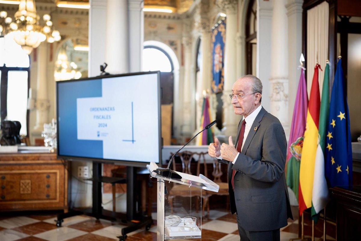 El alcalde de Málaga, Francisco de la Torre, durante la presentación de las ordenanzas fiscales del Ayuntamiento de Málaga y las empresas municipales para 2024. - AYUNTAMIENTO DE MÁLAGA