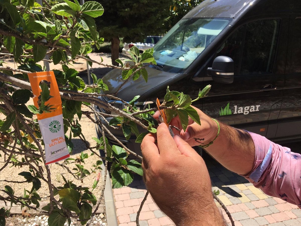 Un técnico de Grupo Lagar coloca una bolsa con insectos depredadores en un arbusto. - GRUPO LAGAR
