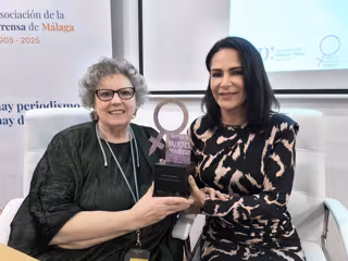 La presidenta de la Asociación de la Prensa de Málaga, Elena Blanco, y la vicepresidenta de Igualdad de la entidad y coordinadora de la Asamblea de Mujeres Periodistas, Teresa Santos, le entregaron el premio, que se suma a los 64 galardones internacionales que ya tiene en su poder.
