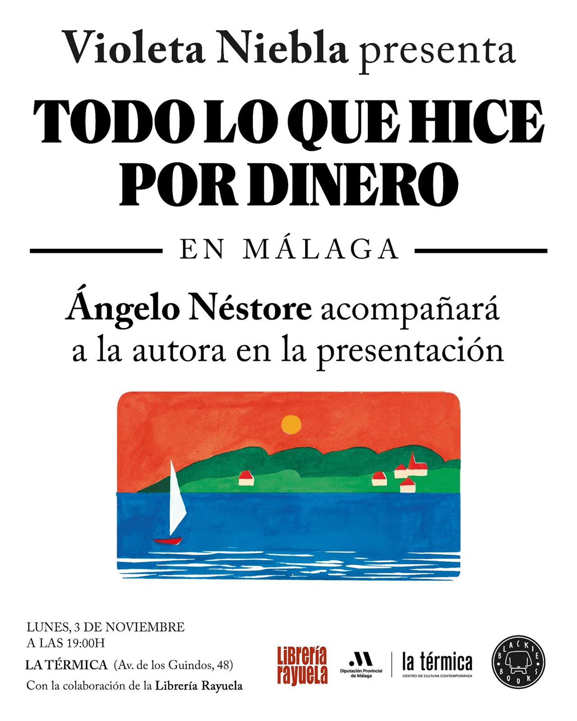 La Térmica, el centro de cultura contemporánea de la Diputación de Málaga, será escenario el próximo lunes, 3 de noviembre, a las 19.00 horas, de la presentación, a modo de actuación, de 'Todo lo que hice por dinero', la primera novela de la autora malagueña Violeta Niebla, publicada por Blackie Books.