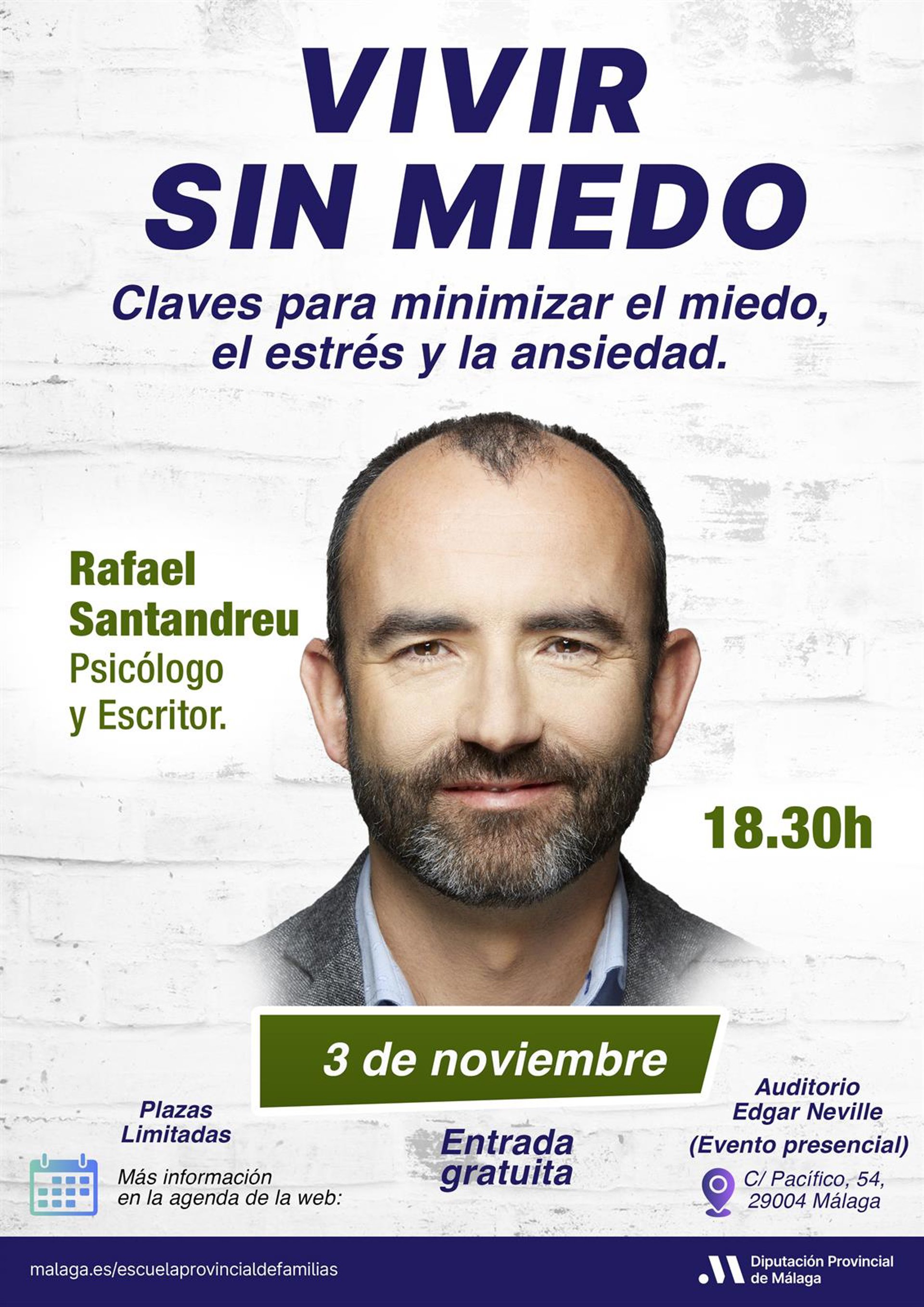 La Escuela de Familias de la Diputación de Málaga trae al auditorio Edgar Neville al psicólogo especialista en estrés y ansiedad Rafael Santandreu, quien ofrecerá el 3 de noviembre una conferencia titulada 'Vivir sin miedo: claves para minimizar el miedo, el estrés y la ansiedad'.
