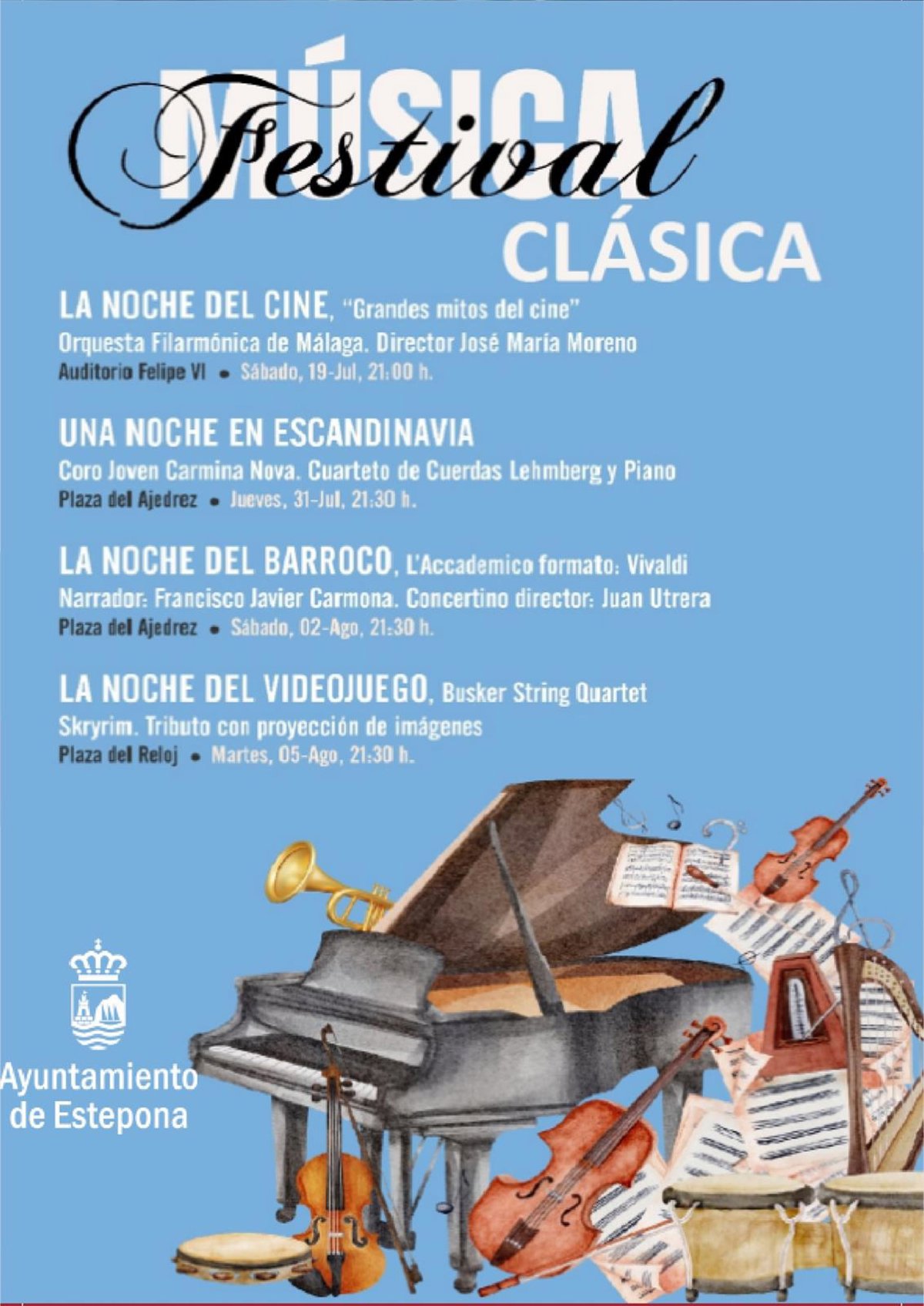 El Ayuntamiento de Estepona (Málaga) ha organizado un festival de música clásica, que se celebrará los días 19 y 31 de julio, y el 2 y 5 de agosto en varias ubicaciones, y cuyo principal objetivo es la difusión y acercamiento de la música clásica a la población.
