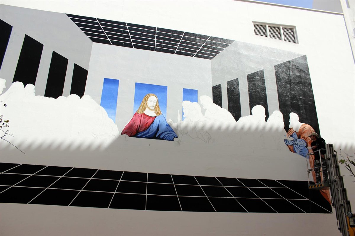 La Ruta de Murales Artísticos del municipio malagueño de Estepona va a incorporar una recreación de 'La Última Cena' de Leonardo da Vinci, una de las mejores obras de la historia del arte. Esta revisión de una de las pinturas más conocidas del Renacimiento italiano está siendo realizada por el artista Curro Leyton en una de las fachadas de la céntrica iglesia San José.