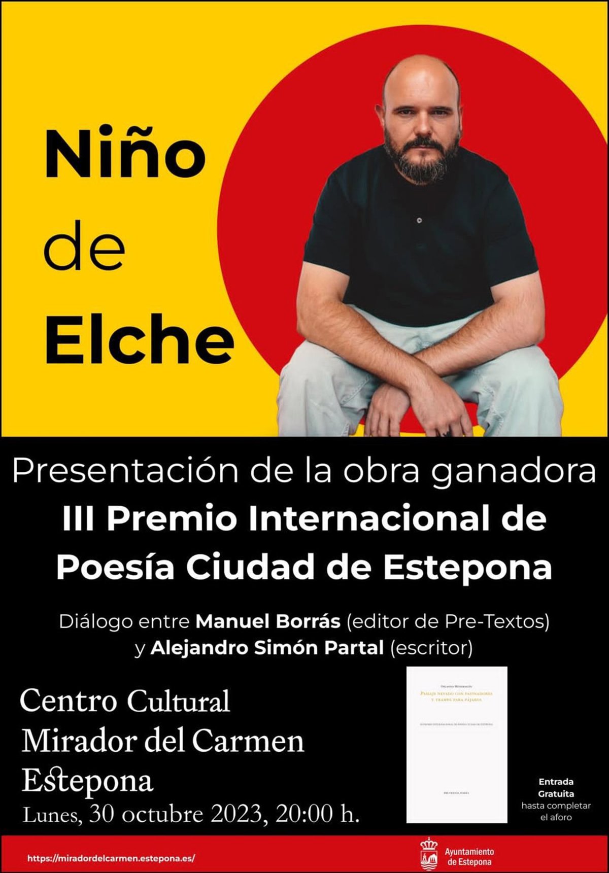 Cartel anunciador del evento que inaugura el próximo lunes 30 de octubre, el nuevo auditorio del Mirador del Carmen con la entrega del III Premio Internacional de Poesía 'Ciudad de Estepona' y el recital de Francisco Contreras Molina, Niño de Elche. - AYUNTAMIENTO DE ESTEPONA
