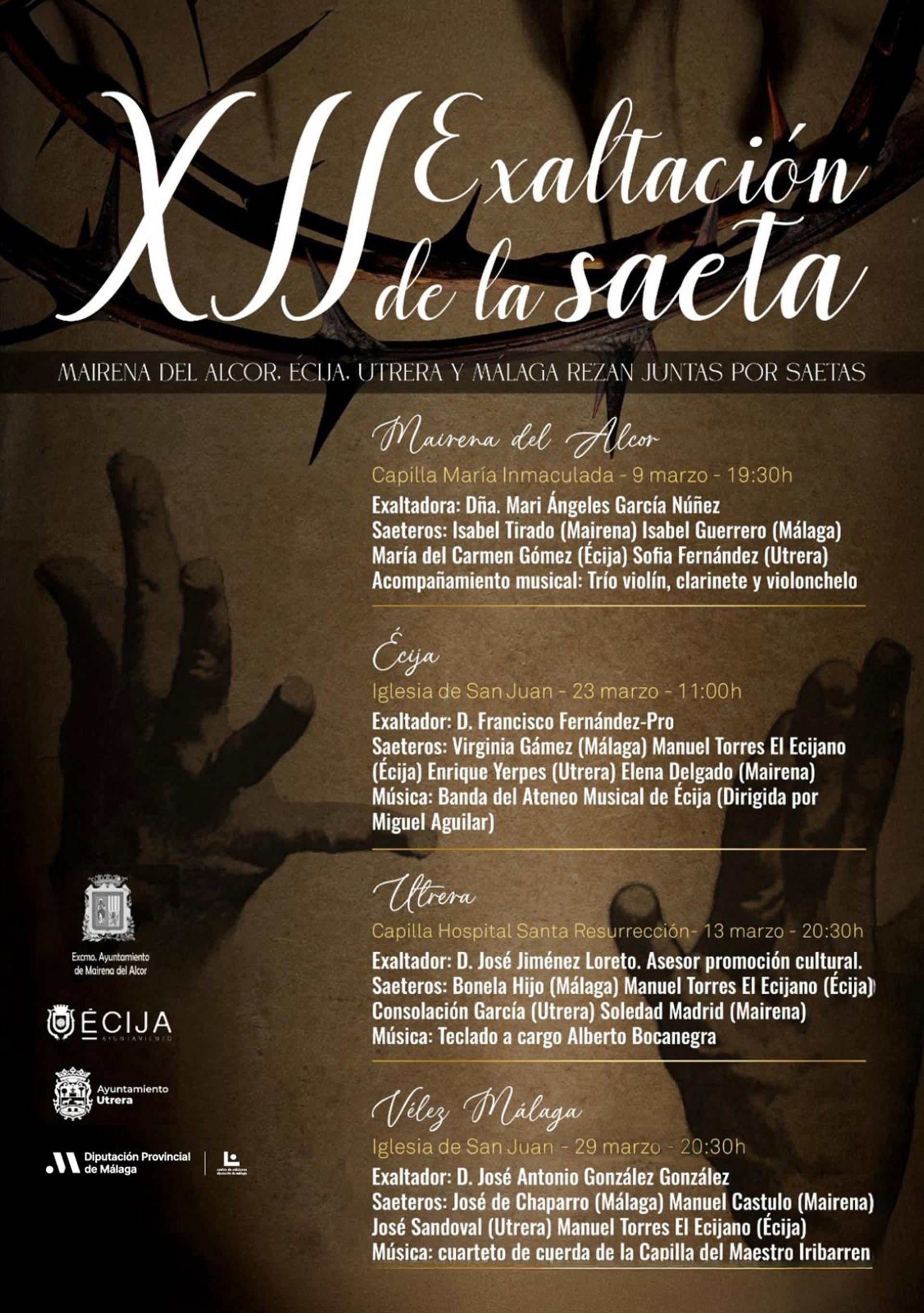 La cuarta y última sesión de la XII Exaltación de la Saeta 'Mairena del Alcor, Écija, Utrera y Málaga rezan juntas por saetas' se celebrará el próximo sábado, 29 de marzo, a las 20.30 horas, en la iglesia de San Juan, en Vélez-Málaga. La entrada es libre. - DIPUTACIÓN DE MÁLAGA