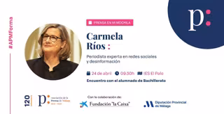 Carmela Ríos, colaboradora de 'El País' experta en desinformación y redes sociales, será la primera periodista que participará en el ciclo de encuentros previstos por la Asociación de la Prensa de Málaga (APM) en el proyecto de alfabetización mediática Prensa en mi Mochila, que cuenta con la colaboración de la Diputación de Málaga y la Fundación 'la Caixa'. Este año llegará a 3.000 escolares de Primaria, Secundaria y Bachillerato de Málaga.