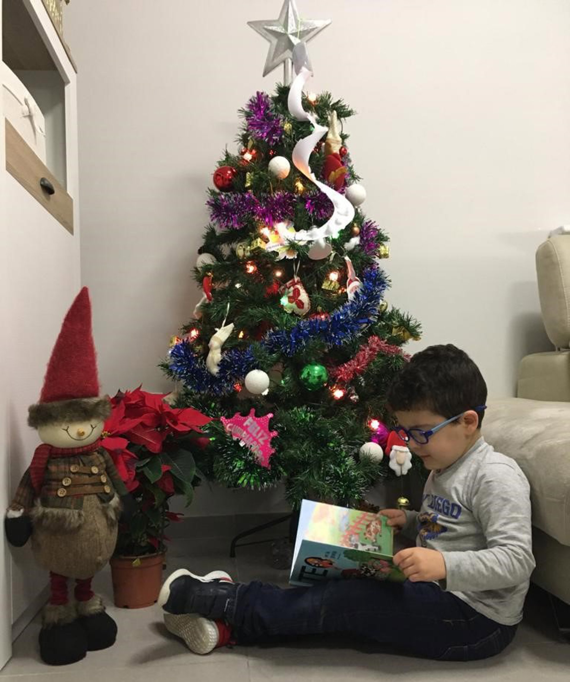 Fotografía de recurso de un niño leyendo un libro junto al árbol de Navidad - VITHAS XANIT INTERNACIONAL