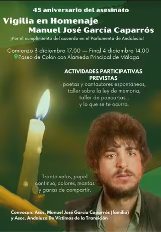 La asociación Manuel José García Caparrós, junto con la asociación Andaluza de Víctimas de la Transición, ha anunciado que realizará una vigilia entre las 17.00 horas del 3 de diciembre y las 14.00 horas de 4 de diciembre, en homenaje a este joven malagueño en el lugar donde fue recogido antes de morir camino del hospital en 1977: la esquina de encuentro entre la calle Alameda de Colón y la Alameda Principal de Málaga. Este punto está reconocido como Lugar de Memoria Democrática de Andalucía desde 2017.