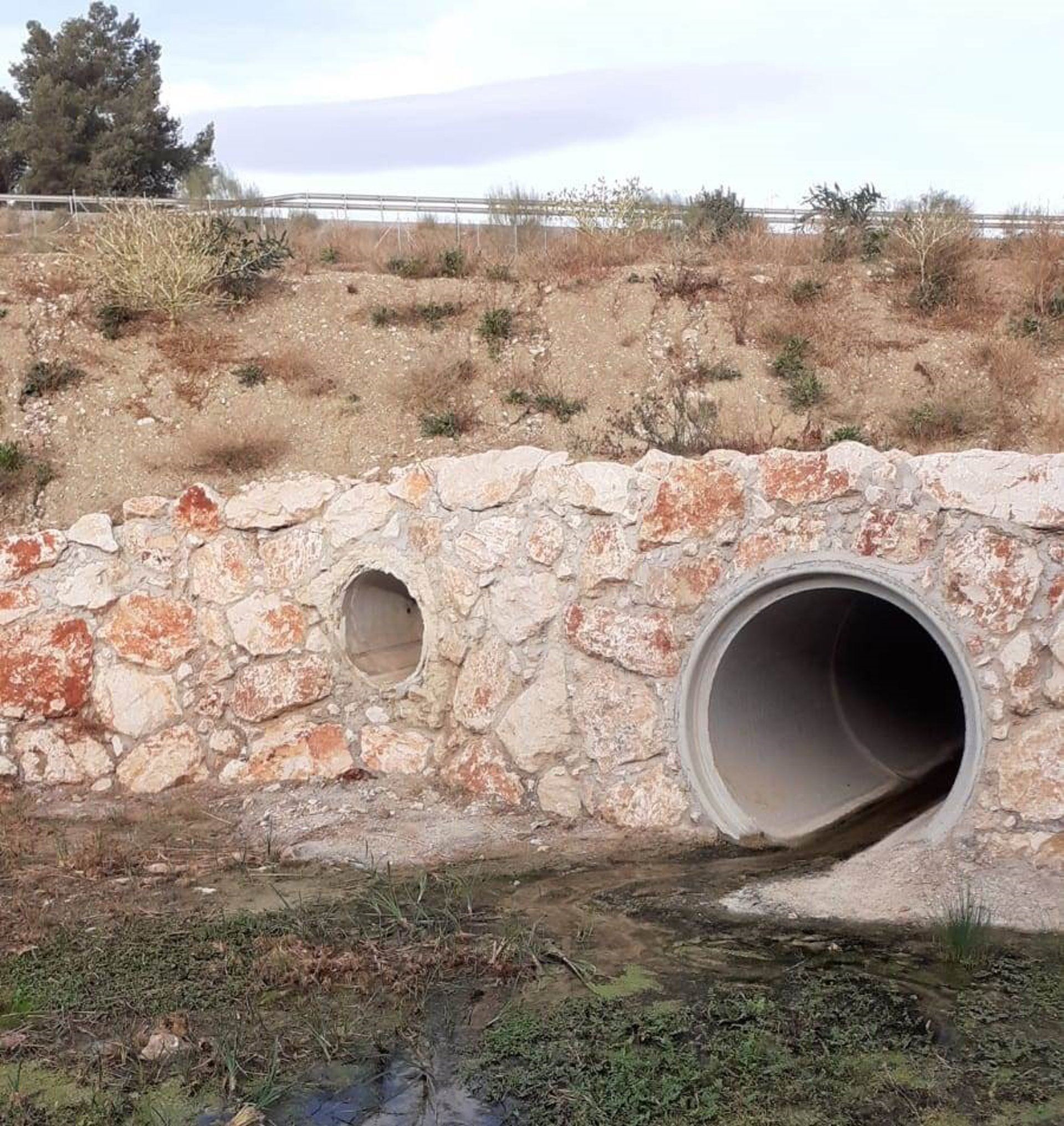 Por último, el tramo este se corresponde con una tubería de dos tramos enterrada que vierte cauce existente en el otro extremo de la carretera A-7056, donde da comienzo un tramo embovedado con un tubo de hormigón.