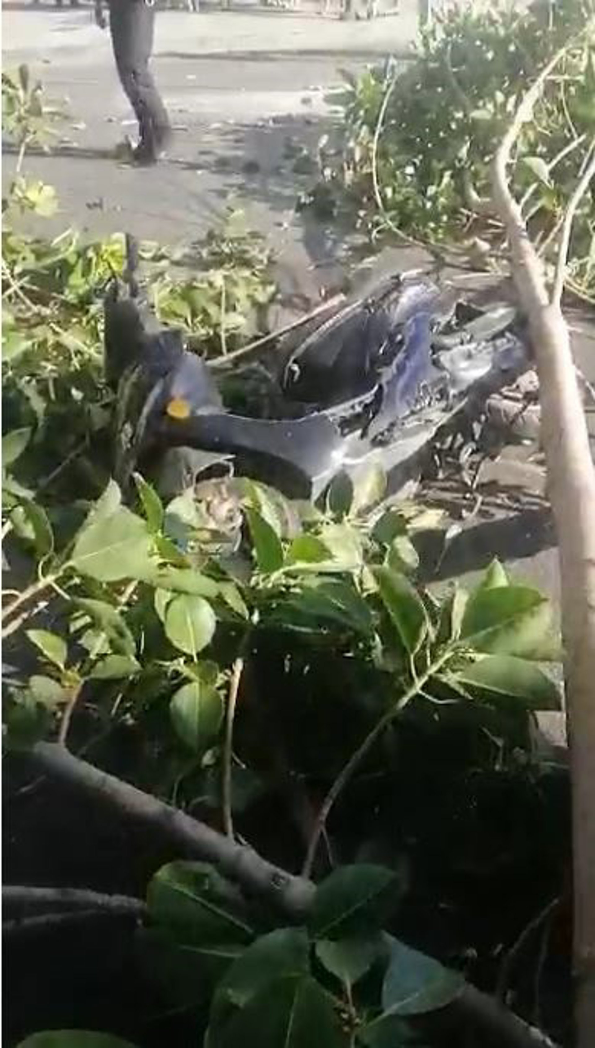 La moto junto a las ramas del árbol caída sobre el motorista - BOMBEROS