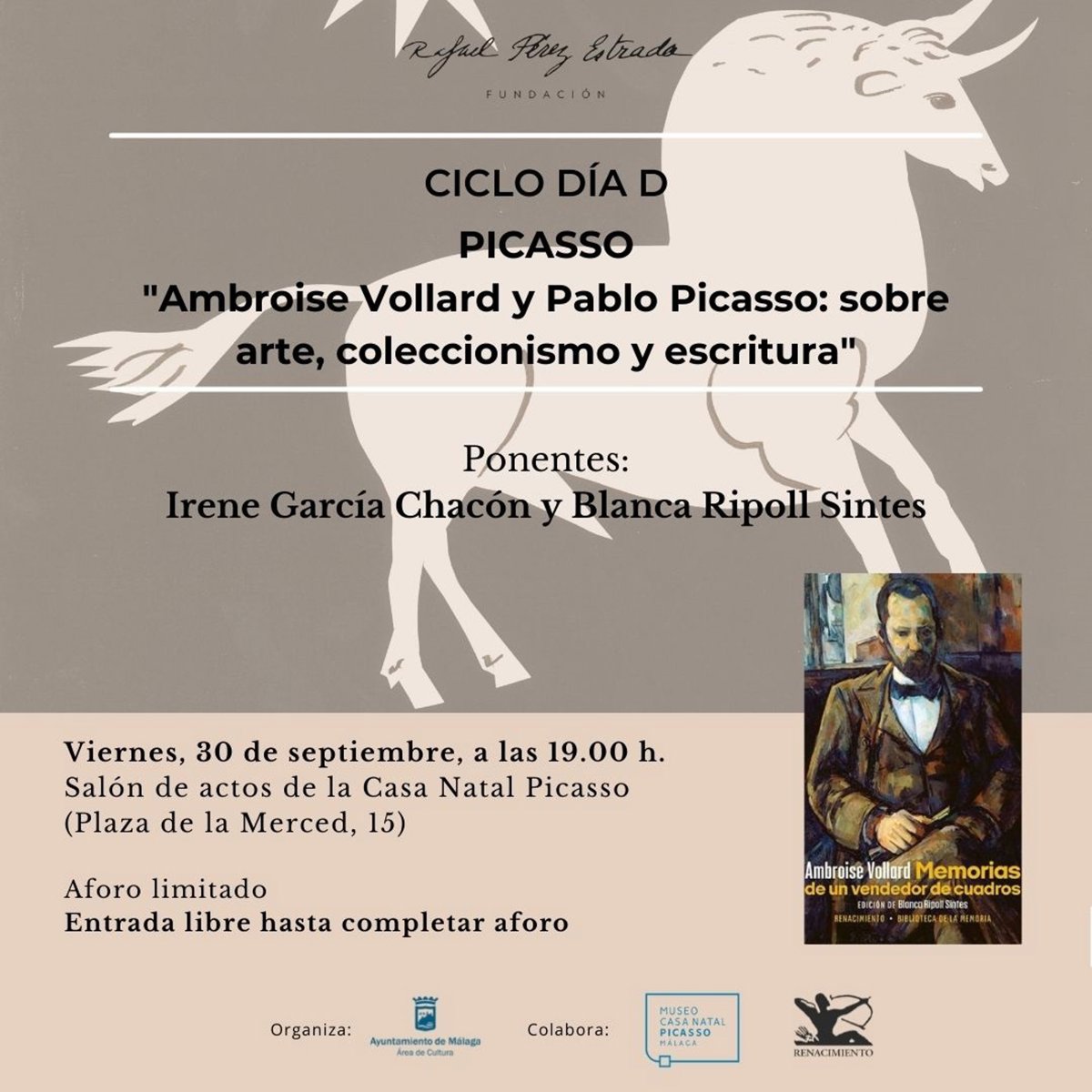 Cartel del encuentro 'Ambroise Vollard y Pablo Picasso: sobre arte, coleccionismo y escritura' - AYUNTAMIENTO DE MÁLAGA