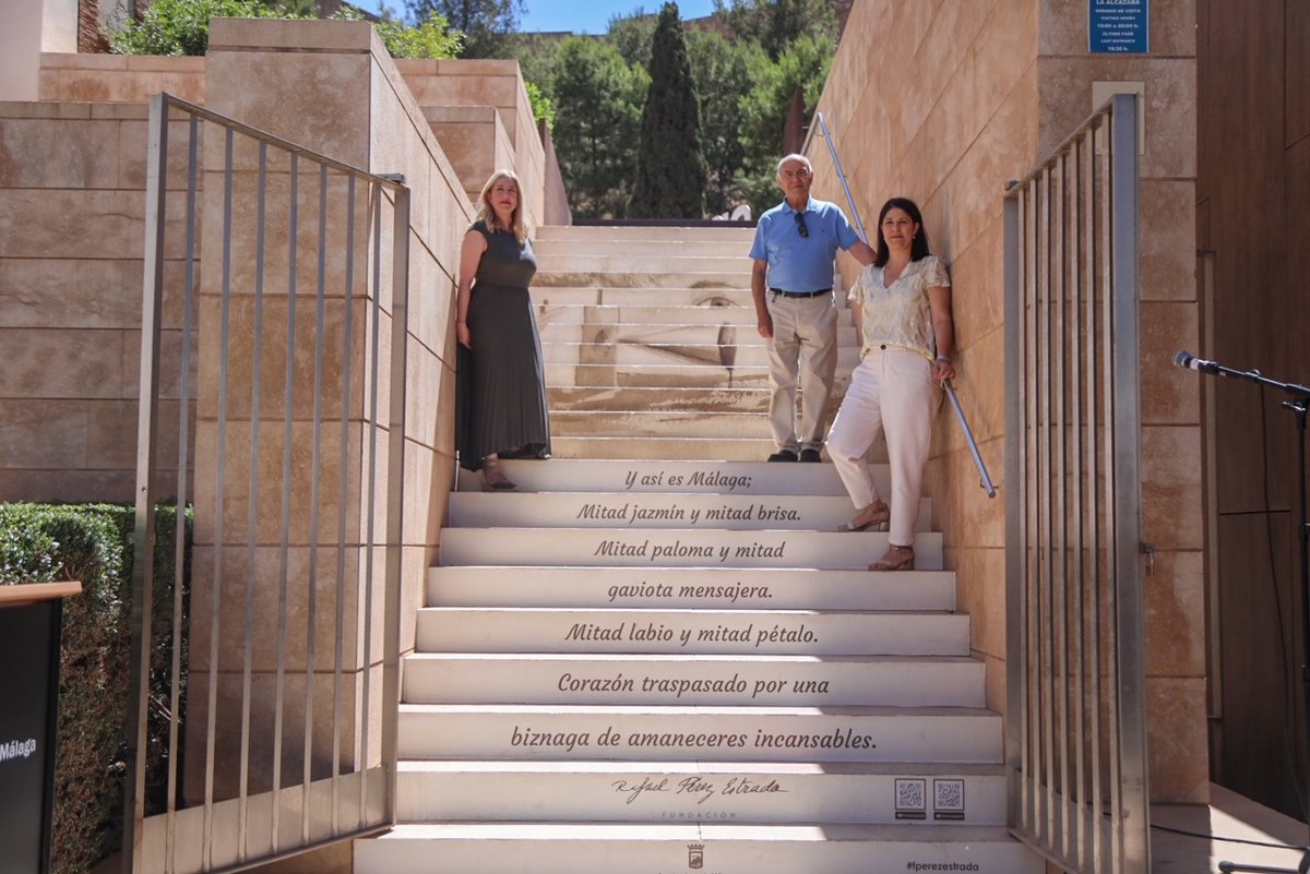 La Fundación Rafael Pérez Estrada ha presentado este miércoles la intervención artístico-literaria realizada en las escaleras de acceso del Mirador de la Alcazaba.