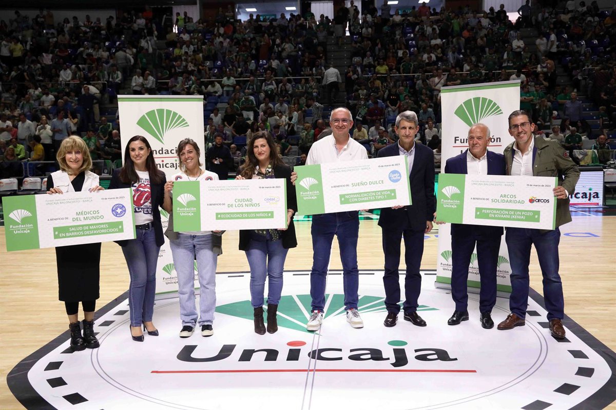 Fundación Unicaja ha entregado sus cheques solidarios para los proyectos de cuatro asociaciones durante el partido dedicado a la labor social de la institución, que ha enfrentado este domingo al Unicaja Baloncesto y al Bara en el Palacio de los Deportes José María Martín Carpena de Málaga.