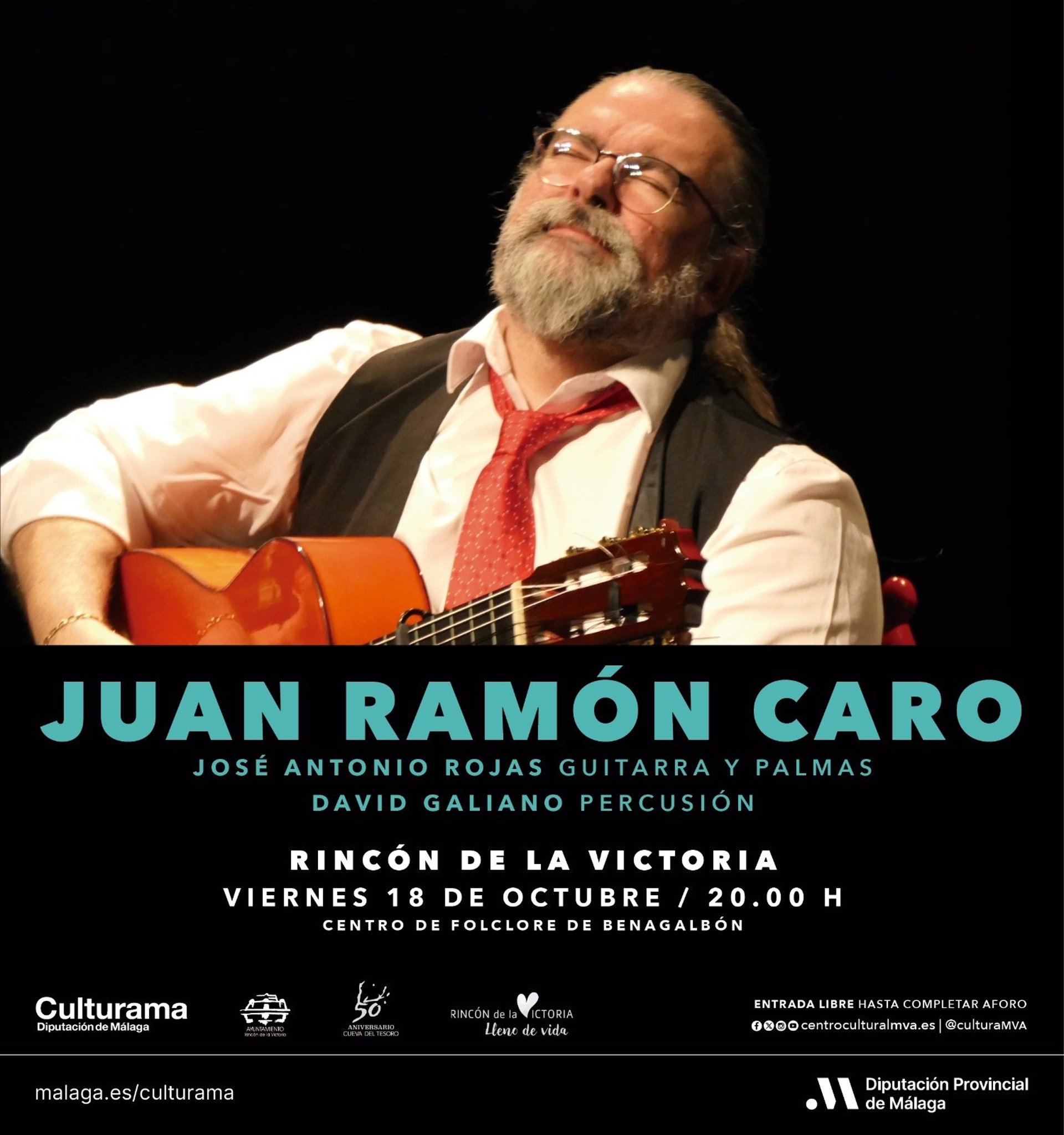 En esta ocasión, la cita será el Centro del Folclore de Benagalbón el lugar de celebración de este concierto donde Juan Ramón Caro, que estará acompañado por José Antonio Rojas, a la guitarra y palmas, y David Galiano en la percusión, ofrecerá un recital de guitarra de concierto, en el que podremos escuchar sus composiciones por soleá, guajira, bulerías, tangos, alegrías, rumbas, etcétera. El evento comenzará a las 20 horas con entrada libre hasta completar aforo.