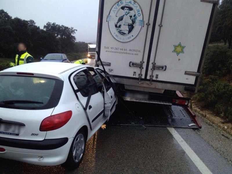 Dos personas han sido trasladadas al Hospital Comarcal de Ronda (Málaga) tras sufrir un accidente de tráfico en el que el vehículo en el que viajaban se ha empotrado por detrás con una grúa que llevaba un camión cargado.