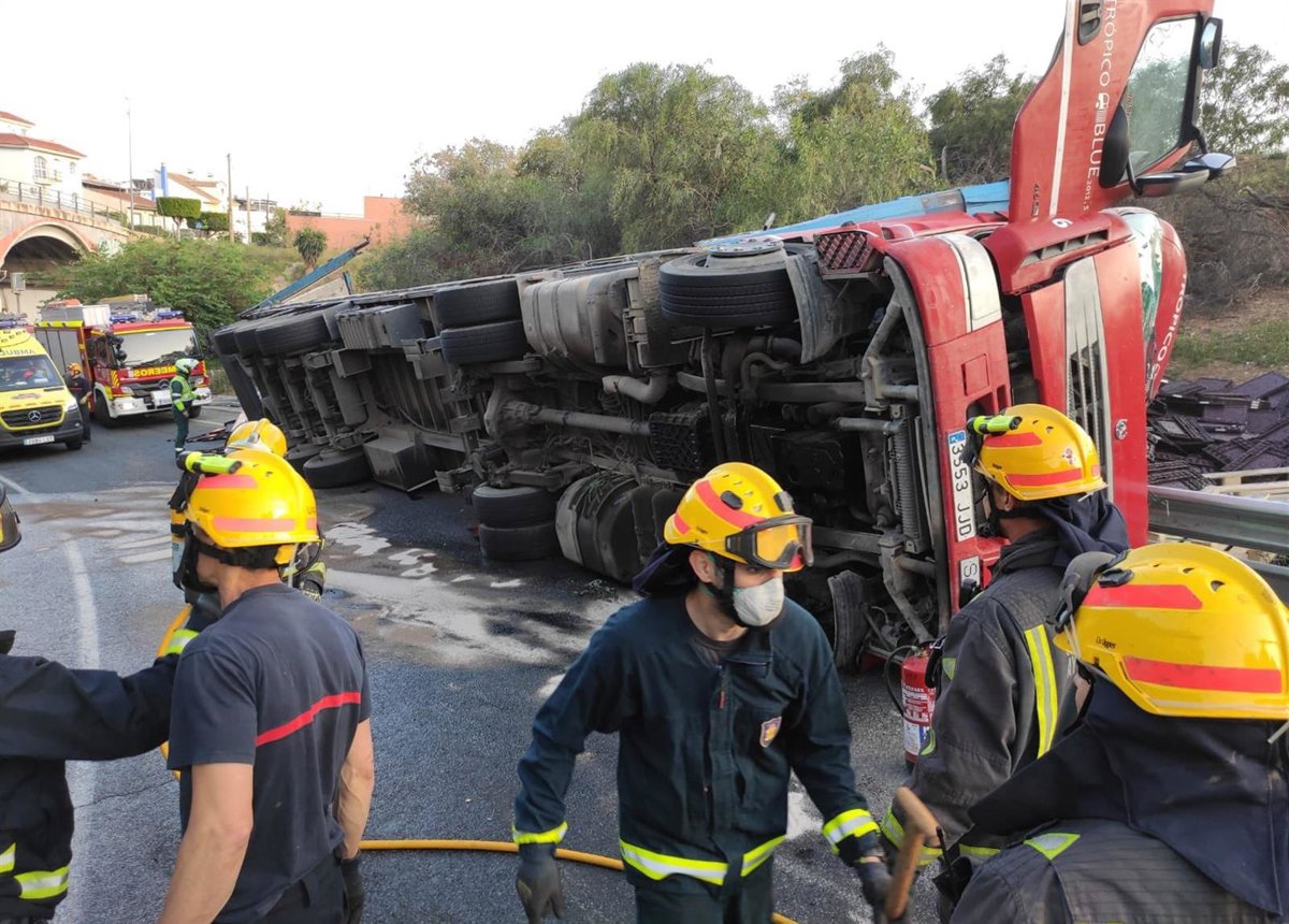 Un hombre de 52 años ha resultado herido y ha tenido que ser evacuado a un hospital en la tarde del viernes tras volcar el camión que conducía en la A-7, en Málaga capital.