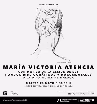 Con motivo de la cesión de los fondos bibliográficos y documentales de María Victoria Atencia a la Diputación de Málaga, el Centro del 27 le ha organizado un homenaje que tendrá lugar el martes, a las 20,00 horas, en el Centro Cultural MVA, en el que se proyectará el vídeo 'Solo amor cuenta' de la productora Mucho Ojo (2017), y a continuación los asistentes podrán disfrutar de una actuación musical de la Joven Orquesta Provincial de Málaga (Jopma). La entrada es gratuita hasta completar aforo.