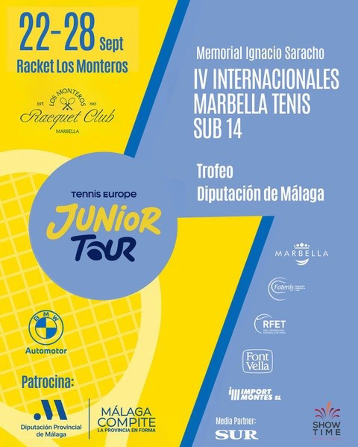 El IV Internacional Marbella Tenis Sub-14 Trofeo Diputación de Málaga reunirá a 275 jóvenes tenistas de 38 países. Será del 22 al 27 de septiembre en el club Racket Los Monteros de Marbella, donde se vuelve a celebrar este torneo que lleva el nombre de Memorial Ignacio Saracho.