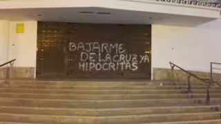 La pintada, en la que se puede leer el texto "Bajarme de la cruz ya hipocritas" (sic), que ya a lo largo de la mañana ha sido retirada, ocupa tres de las cuatro hojas de la puerta del templo y ha sido efectuada con un aerosol, según han informado a Europa Press fuentes municipales, que han señalado que por el momento se desconoce su autoría.