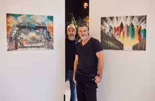 Antonio Banderas y José Luis Puche junto a la exposición de este último con motivo de 'Gypsy'. - TEATRO DEL SOHO CAIXABANK