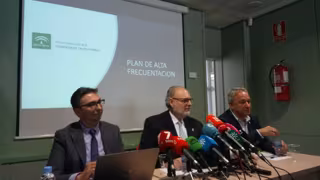 El portavoz del Plan de Alta Frecuentación, José López Miranda, el gerente del SAS, Miguel Ángel Guzmán, y el director general de Asistencia Sanitaria, Diego Vargas, informan sobre la gripe. - EUROPA PRESS