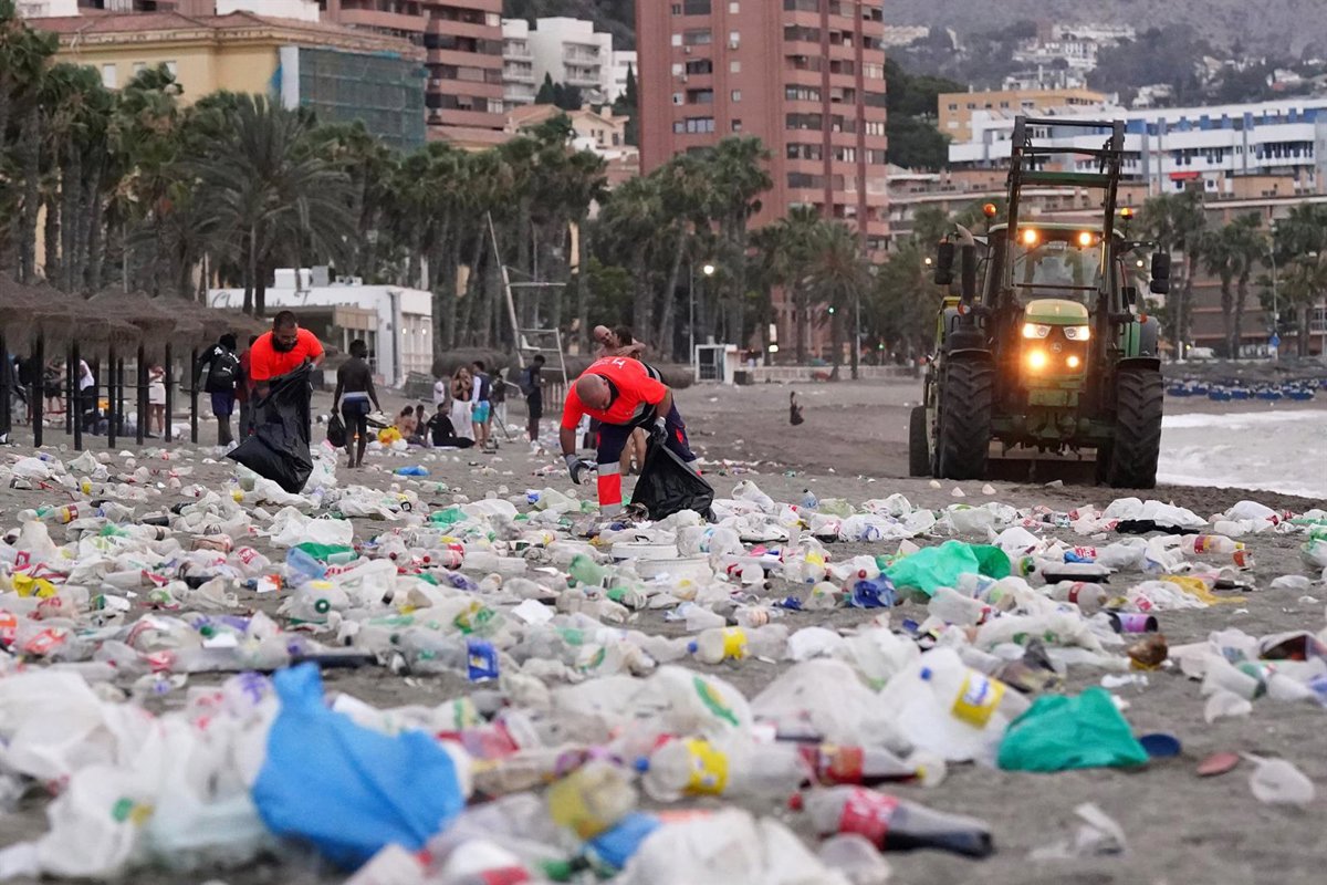Miembros del servicio de limpieza municipal de Málaga recogen restos de basura en la playa de La Malagueta tras la celebración de la noche de San Juan. - Álex Zea - Europa Press