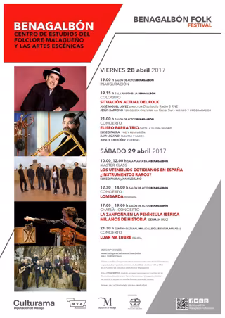 De esta forma, el centro de Benagalbón contará con actuaciones del reconocido músico e investigador Eliseo Parra con la formación Eliseo Parra Trío, de Castilla y León y Madrid, el viernes 28 a las 21.00 horas; de Lombarda (Granada), como difusora de la música tradicional andaluza y de la Alpujarra el sábado 29 de abril a las 12.30 horas.