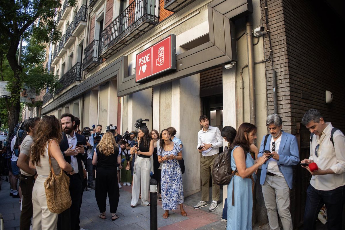 Periodistas a las puertas de la sede federal del PSOE en la calle Ferraz, mientras se celebra la reunión de la Comisión Ejecutiva Federal del PSOE, a 16 de junio de 2025, en Madrid (España). El PSOE se reúne hoy después de que el secretario de organizació - Alejandro Martínez Vélez - Europa Press