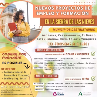 El primer programa se denomina 'Proyecto de Empleo y Formación en el Ámbito Sociocultural. Dinamización cultural y de Ocio en la Sierra de Las Nieves' y se desarrolla en centros de formación de Alozaina y Yunquera.