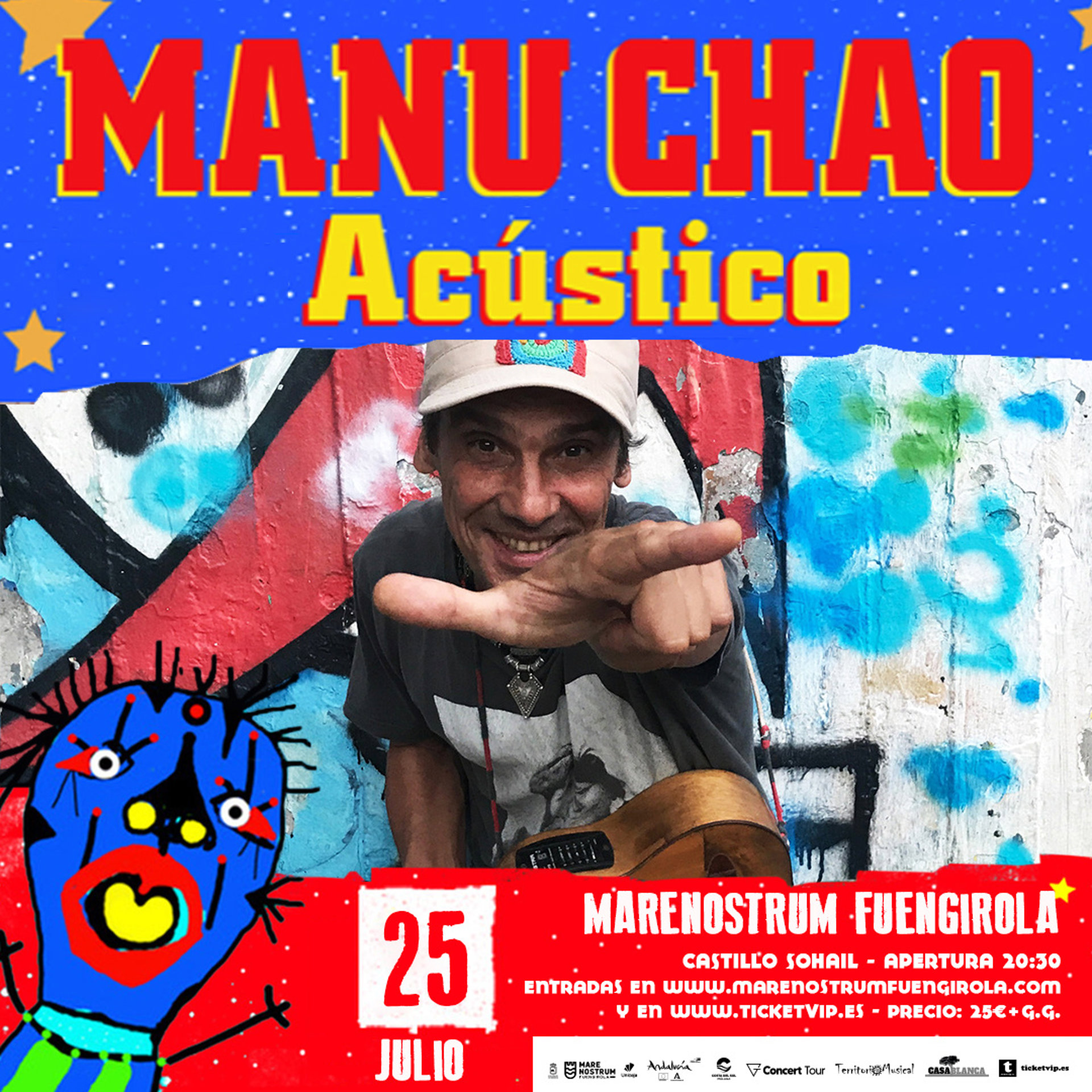 Marenostrum Fuengirola recibirá, el próximo 25 de julio, una de las actuaciones que Manu Chao realiza de forma esporádica. El recinto de la localidad malagueña será testigo del talento musical del artista a solas con su guitarra, en un formato acústico donde la sintonía con su público se hará visible dentro de escenario Fundación Unicaja / castillo Sohail.