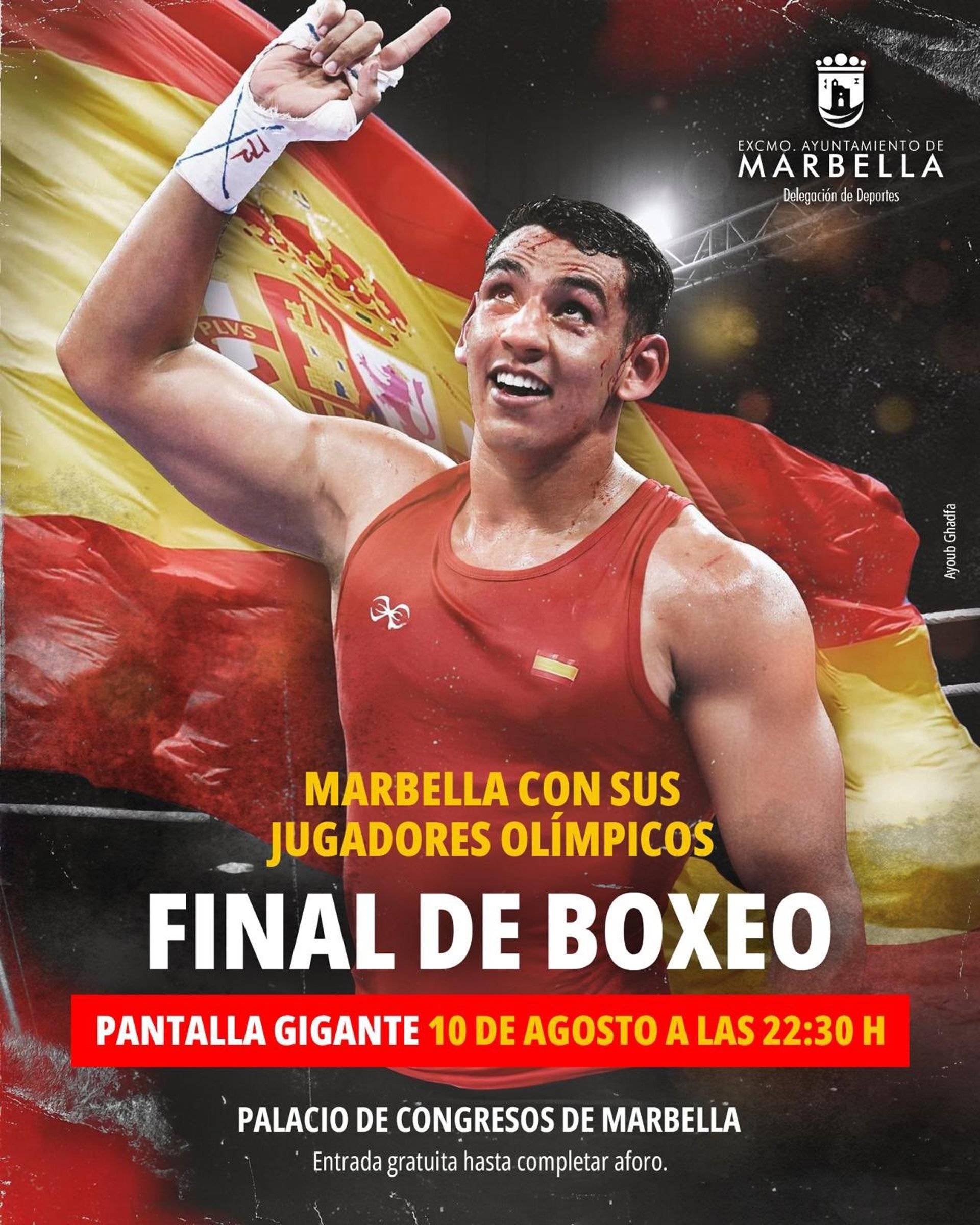 El Ayuntamiento de Marbella (Málaga) instala una pantalla gigante en el Palacio de Congresos para que este próximo sábado quienes lo deseen puedan contemplar y apoyar al boxeador local, Ayoub Ghadfa, en la disputa del combate final en la categoría +92 kilos, en el que se decidirán el oro y la plata olímpica.