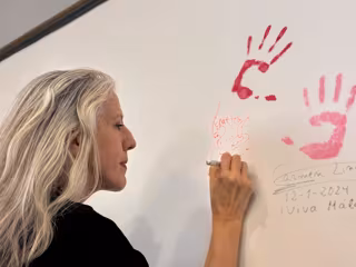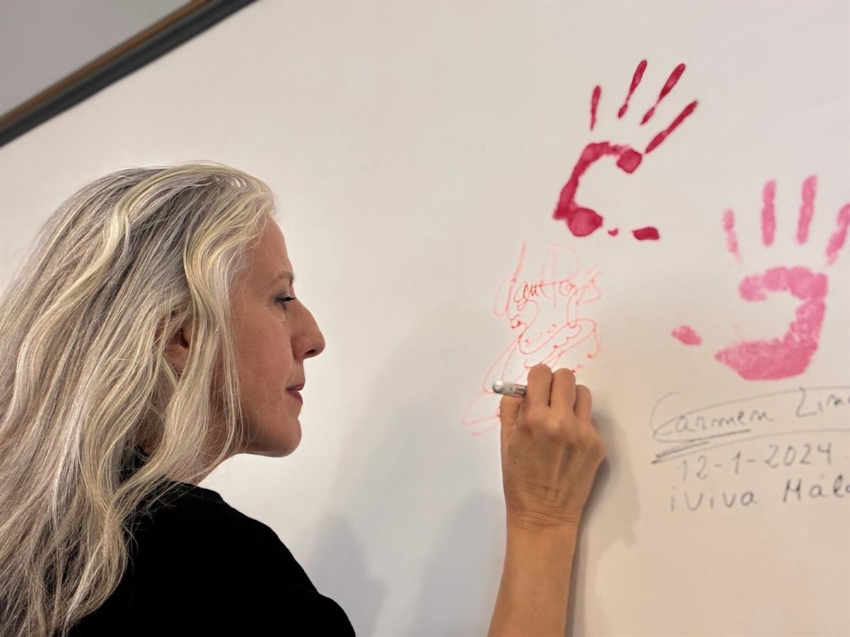 María Pagés firmando debajo de la huella de su mano, que ha estampado en la tercera planta del Teatro Cervantes - PROCULTURA