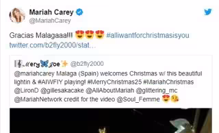 Tras el vídeo de una fan en el que se puede ver parte del espectáculo de luces navideño de la capital malagueña, Carey cita el mensaje con las palabras 'Gracias, Málaga' y emoticonos. En una hora el mensaje de Twitter, recogido por Europa Press, acumula más de 2.600 Me Gusta y supera los 800 retuiteos.