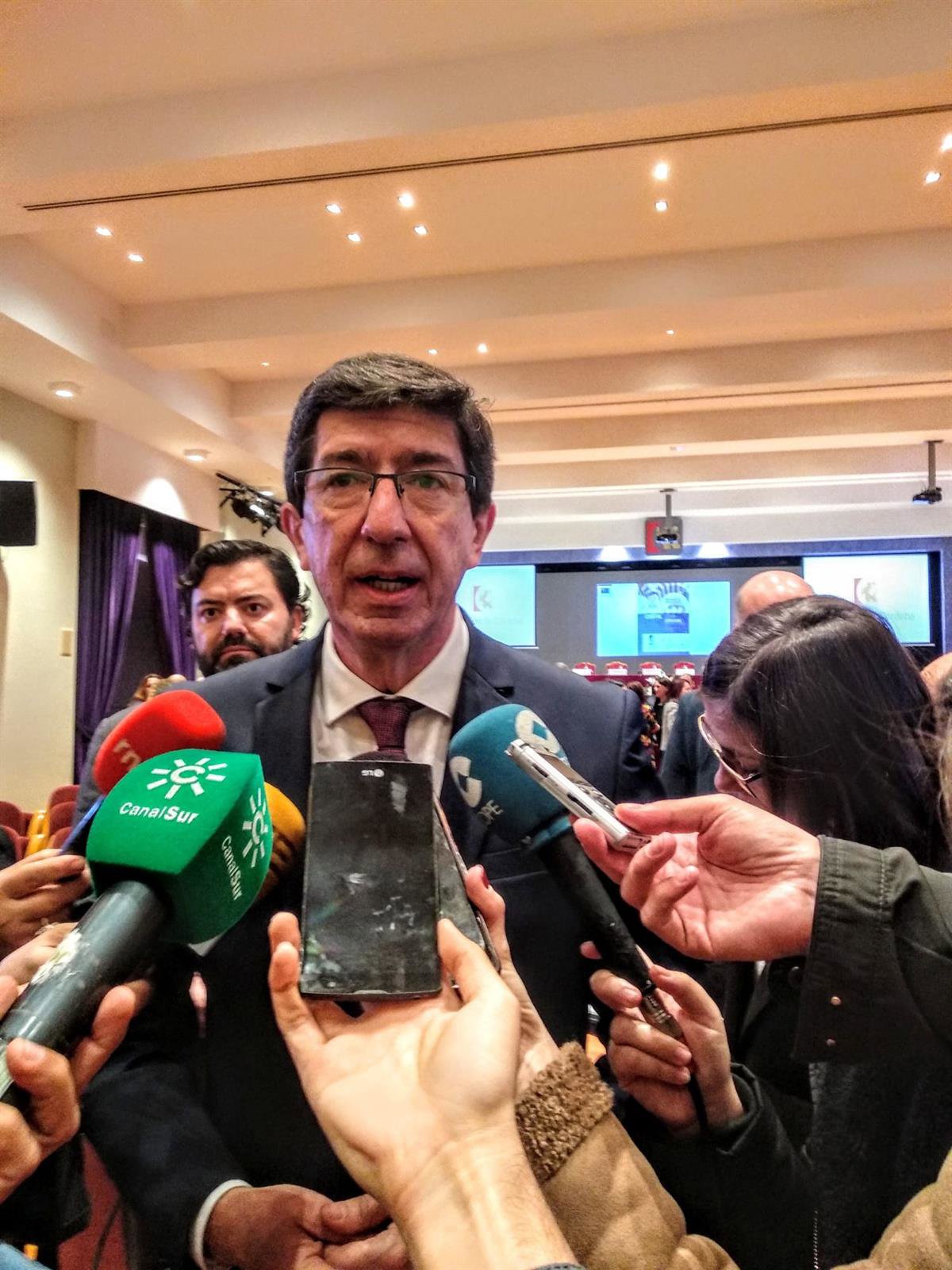 El vicepresidente de la Junta de la Andalucía y consejero de Turismo, Regeneración, Justicia y Administración Local, Juan Marín, atiende a los periodistas. - EUROPA PRESS